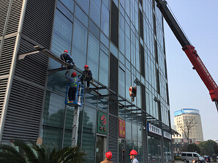 綠地鉑驪酒店幕墻玻璃更換施工現(xiàn)場照。