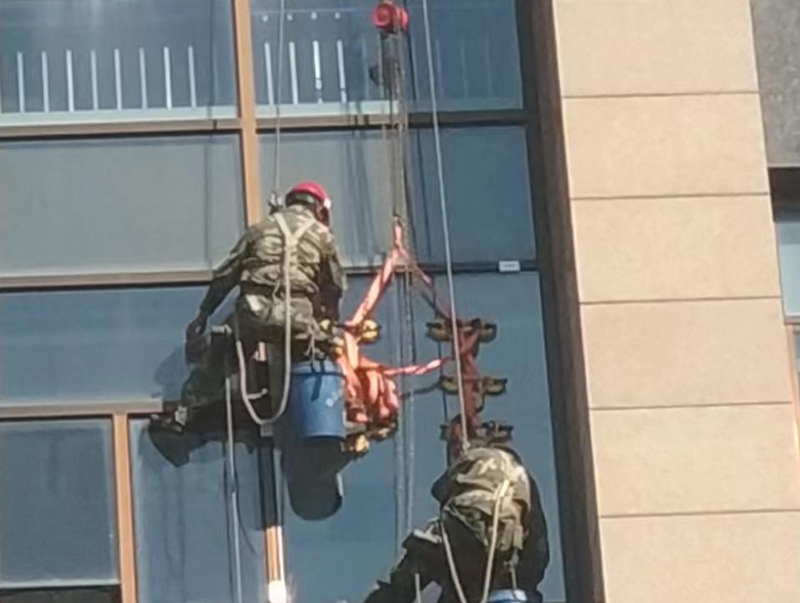 奉賢區(qū)檢測(cè)中心幕墻玻璃更換施工現(xiàn)場照。